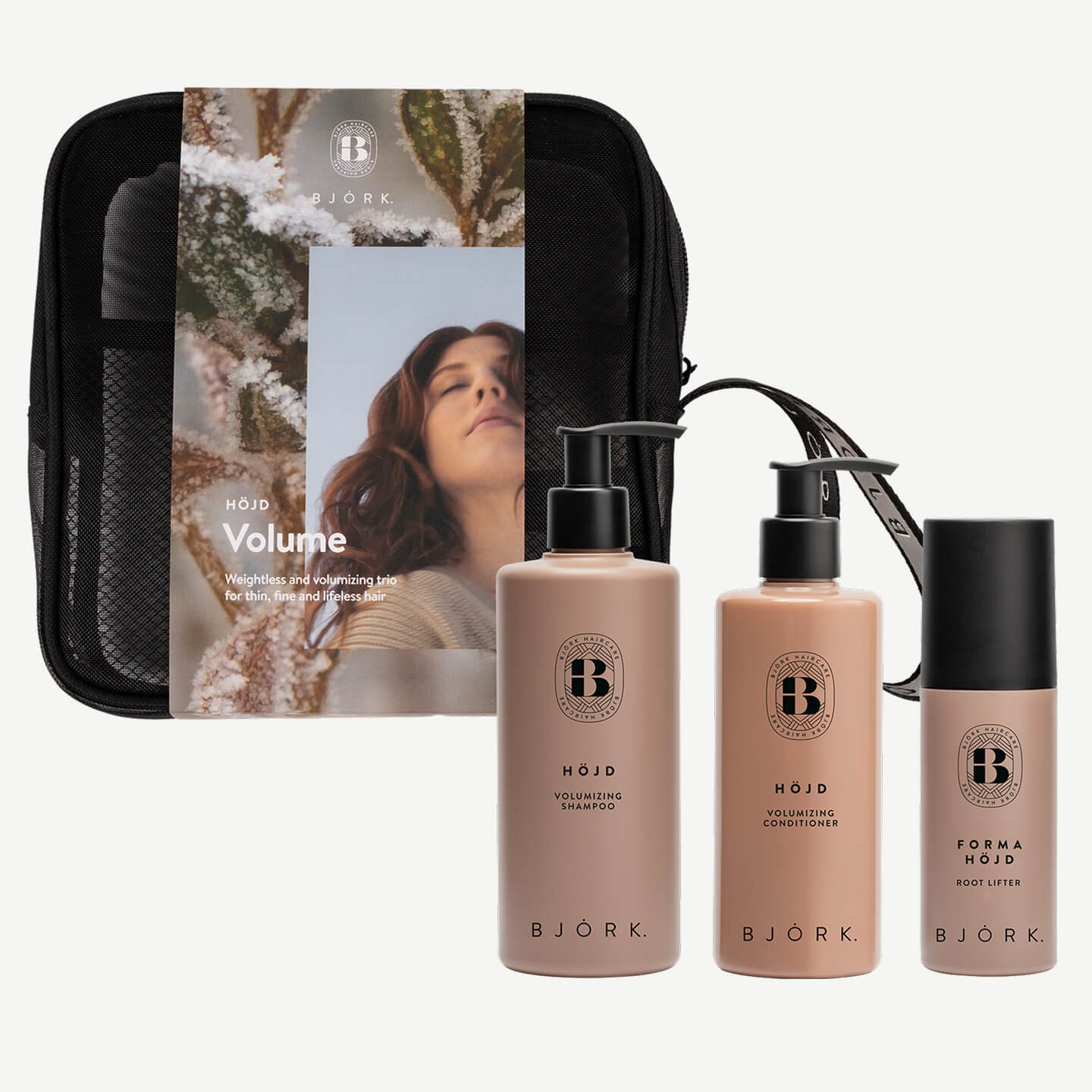 Tre volymfavoriter i en och samma förpackning. Prova Björks lätta och volymgivande trio för tunt, fint och livlöst hår, förpackat i en stilren necessär av återvunnet material. Håret får en boost, naturlig glans och näring från rot till topp. Upplev svensk hårvård som gör skillnad, på riktigt.