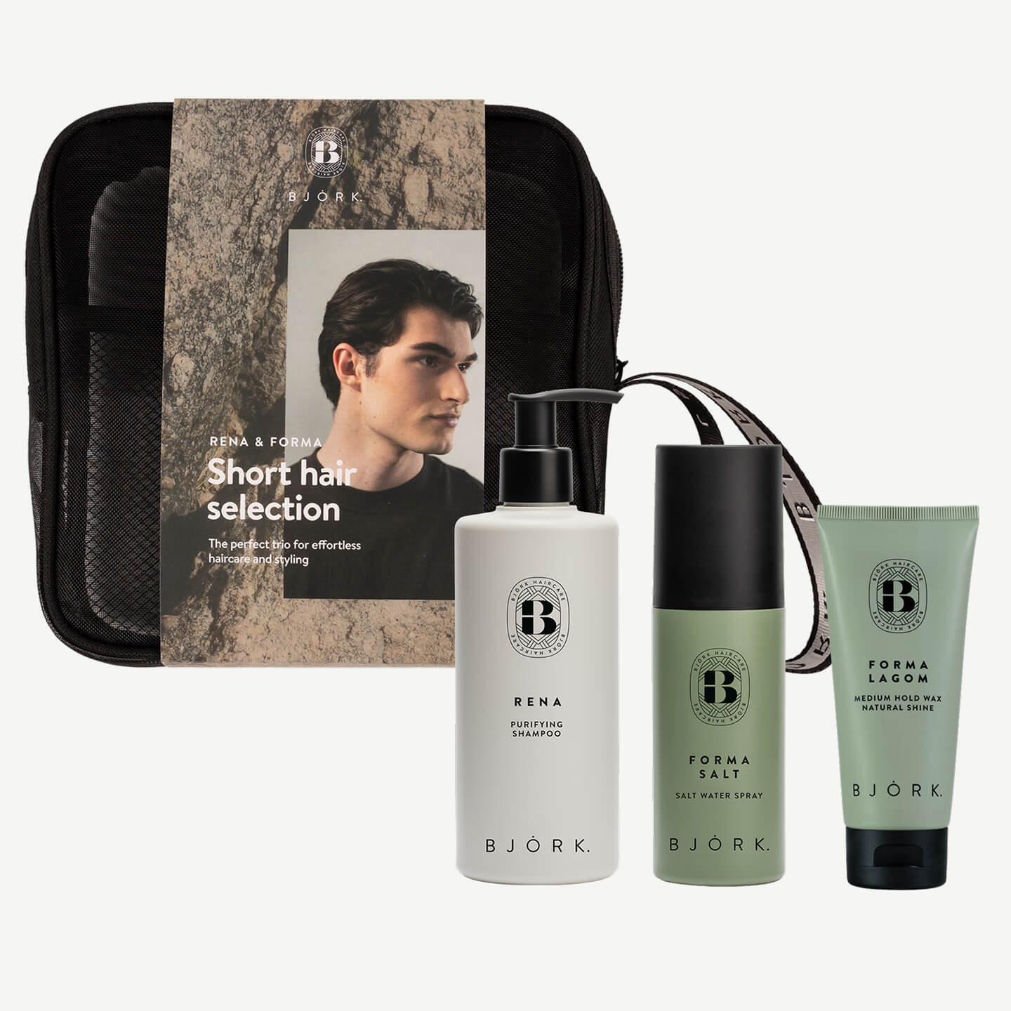 En skräddarsydd trio för enkel och effektiv hårvård med styling för dig som har en kortare frisyr, förpackat i en stilren necessär av återvunnet material. Perfekt att ta med i väskan, vart du än är påväg.