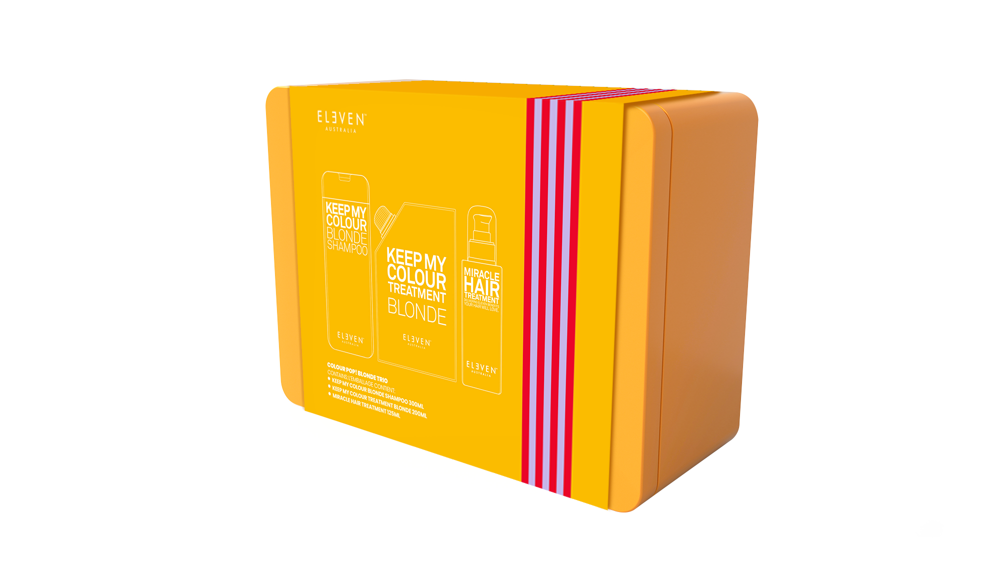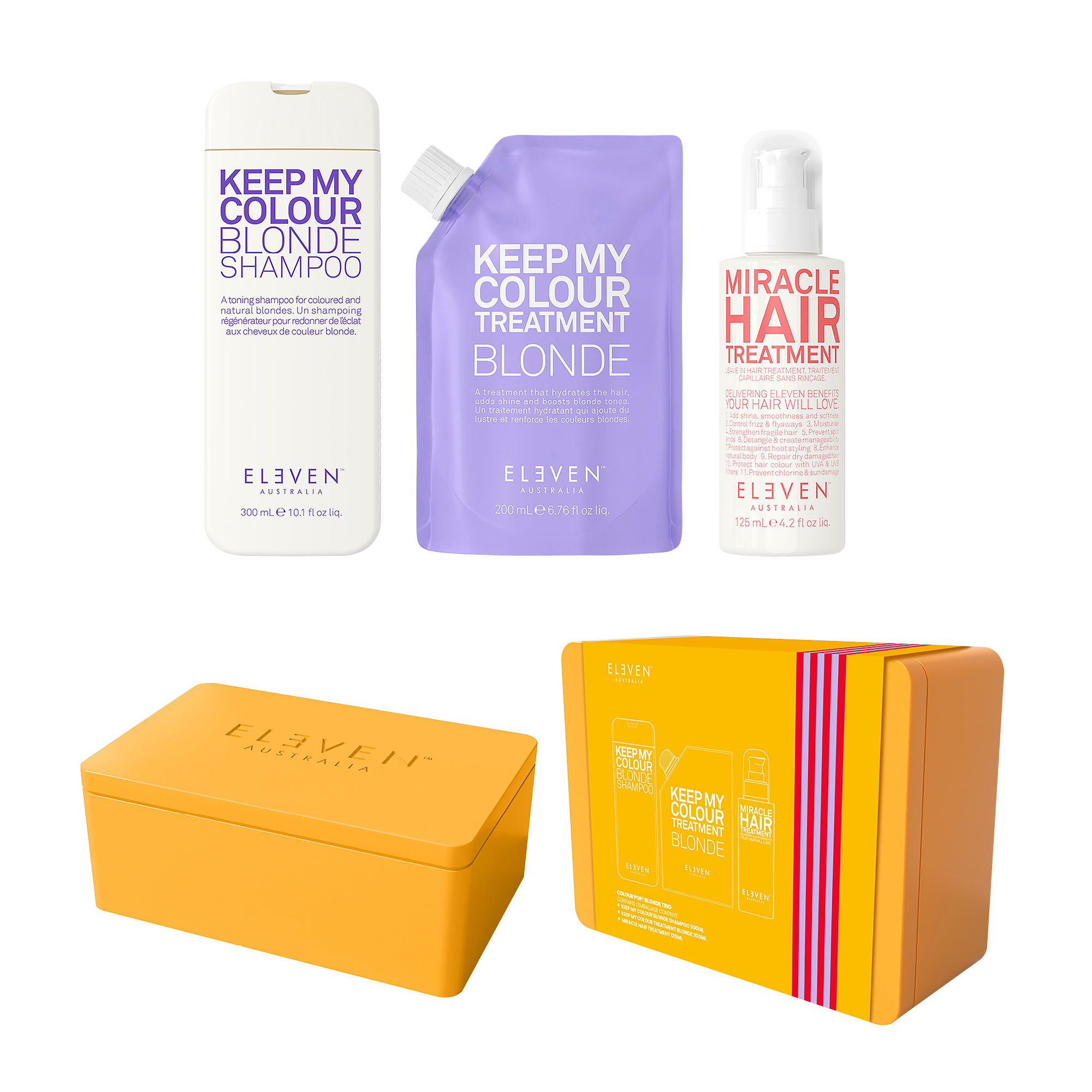 Keep My Colour Blonde Shampoo: Water (Aqua) (Eau), Sodium Lauroyl Methyl Isethionate, Cocamidopropyl Betaine, Acrylates Copolymer, PEG-12 Dimethicone, Glycerin, Cucumis Sativus (Cucumber) Extract, Chamomilla Recutita (Matricaria) Flower Extract, Camellia Sinensis (Green Tea) Leaf Extract, Cymbopogon Schoenanthus (Lemongrass) Extract, Hydrolyzed Soy Protein, Hydrolyzed Quinoa, Sodium Levulinate, Triethyl Citrate, Polyquaternium-10, PEG-150 Distearate, Mica, Propylene Glycol, Triethanolamine, Phenoxyethanol, Potassium Sorbate, Sodium Benzoate, Benzoic Acid, Dehydroacetic Acid, Citric Acid, Sodium Hydroxide, Fragrance (Parfum), Linalool, Benzyl Alcohol, Titanium Dioxide (CI 77891), Ext. Violet 2 (CI 60730) Keep My Colour Blonde Treatment: Water (Aqua) (Eau), Cetearyl Alcohol, Propylene Glycol, Isopropyl Myristate, Cetyl Alcohol, Ceteareth-20, Argania Spinosa (Argan) Kernel Oil*, Chamomilla Recutita (Matricaria) Flower Extract, Rosmarinus Officinalis (Rosemary) Leaf Extract, Cymbopogon Citratus (Lemongrass) Extract, Macadamia Integrifolia Seed Oil, Lactic Acid, Hydrolyzed Quinoa, Trideceth-12, Cetrimonium Chloride, 1, 2-Hexanediol, Amodimethicone, Behentrimonium Methosulfate, Tetrasodium EDTA, Phenoxyethanol, Ethylhexylglycerin, Potassium Sorbate, Sodium Benzoate, Chlorphenesin, Fragrance (Parfum), Linalool, Benzyl Alcohol, Ext. Violet 2 (CI 60730) *Certified organic ingredient / Ingrédient certifié biologique Miracle Hair Treatment: Water (Aqua) (Eau), Cetearyl Alcohol, Cyclopentasiloxane, Propylene Glycol, Isopropyl Myristate, Silk Amino Acids, Citrus Glauca (Desert Lime) Fruit Extract, Acacia Victoriae (Wattle) Fruit Extract, Santalum Acuminatum (Quandong) Fruit Extract, Glycerin, Cetyl Alcohol, Butyl Methoxydibenzoylmethane, Quaternium-80, Sodium Laneth-40 Maleate/Styrene Sulfonate Copolymer, Butylene Glycol, Dimethiconol, Cyclohexasiloxane, Behentrimonium Methosulfate, Ethylhexyl Methoxycinnamate, BHT, Phenoxyethanol, Potassium Sorbate, Sodium Benzoate, Benzoic Acid, Dehydroacetic Acid, Citric Acid, Fragrance (Parfum), Benzyl Salicylate, Coumarin, Benzyl Benzoate, Benzyl Alcohol