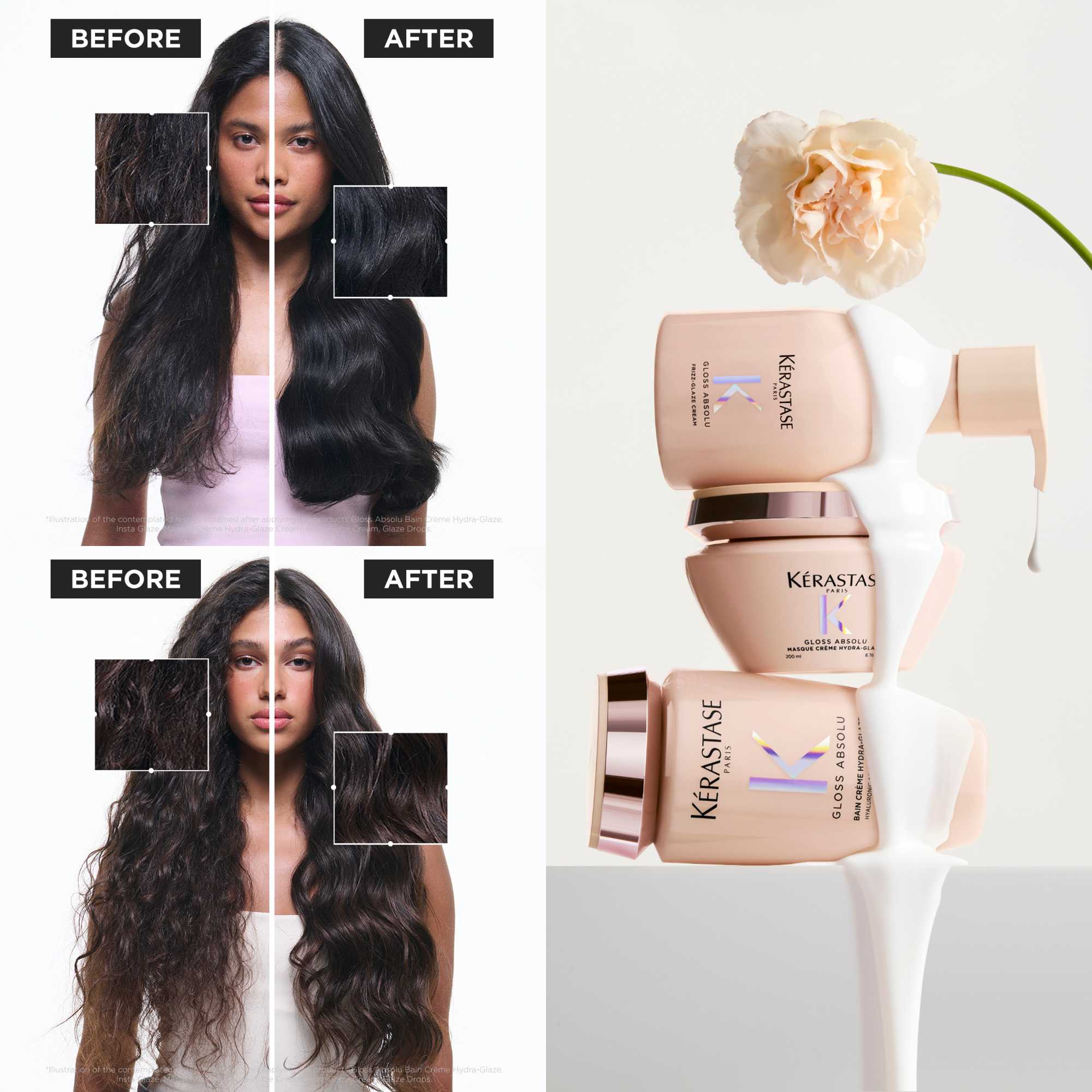 Gloss Absolu Frizz-Glaze Cream är en leave-in-stylingkräm för tjock, frissigt hår som kräver djupgående näring och extra frizz-kontroll. Resultatet är ett skinande, återfuktat, spänstigt och glansigt hår, med upp till 4 dagar anti-frizz. Den krämiga och rika formulan skyddar håret från frizz, även i de mest luftfuktiga och varma förhållanden, och skyddar håret från vatten i upp till 98% luftfuktighet.