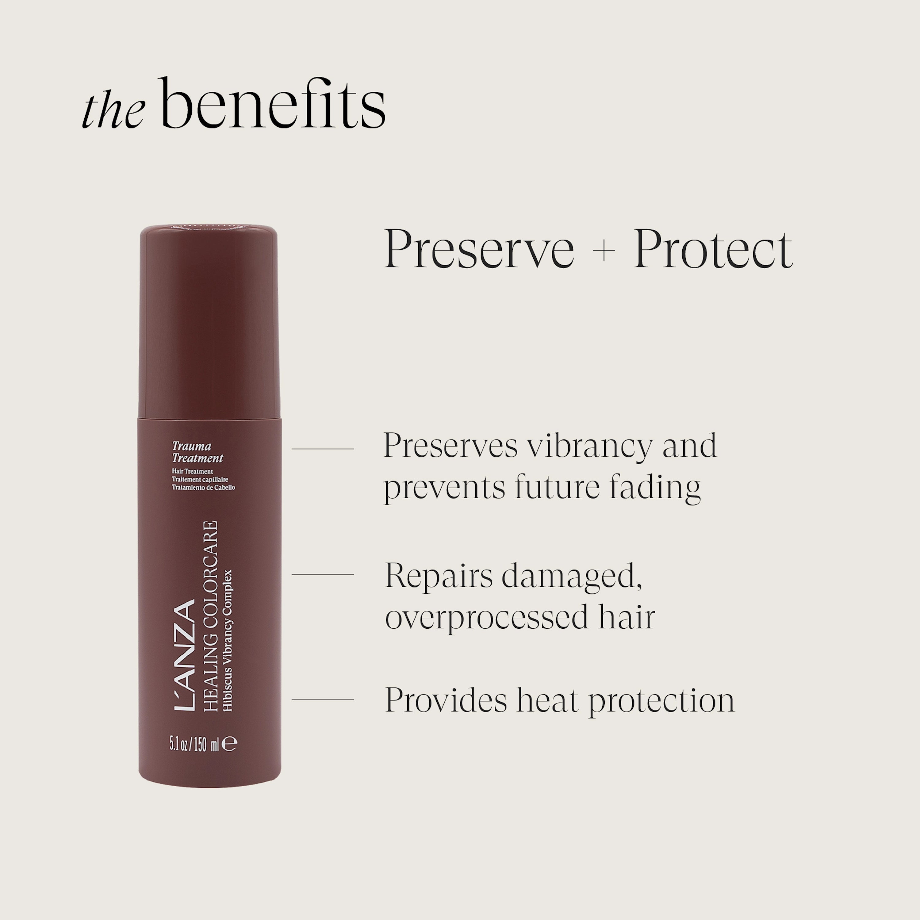 Trauma Treatment tillför håret Ceramid-2. Ceramider är viktiga oljelösliga sammansättningar (eller lipider) som finns i håret och har till uppgift att upprätthålla rätt fuktighet och elasticitet. Håret innehåller två olika slags ceramider: den lite ovanligare Ceramid-1 (12 %) och den vanligare Ceramid-2 (88 %). När håret har överbehandlats blir det brist på de här viktiga ceramiderna, vilket gör håret torrt, skört och bräckligt. Skadat hår kan inte ta emot och behålla färgen i samband med behandling. Men genom L’ANZA:s Trauma Treatment tillförs håret på nytt Ceramid-2, vilket återskapar hårets vigör och förhöjer färgupptagningsförmågan.