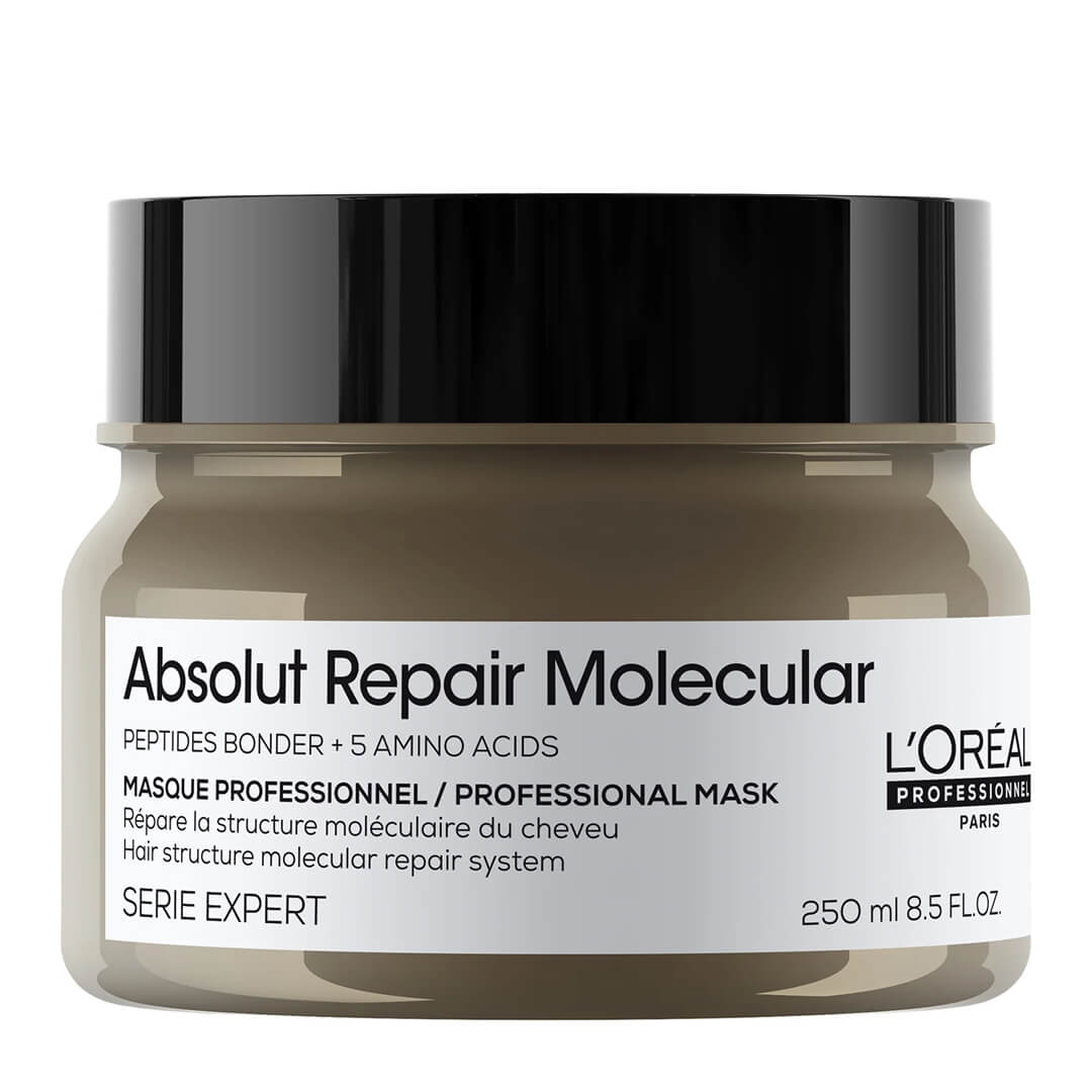 L’Oréal Professionnel Absolut Repair Molecular Rinse-Off Mask är en intensivt reparerande hårmask framtagen för att återuppbygga skadat och försvagat hår på djupet. Formulan är berikad med Peptides Bonder och fem aminosyror som tillsammans verkar på molekylär nivå för att stärka hårfibrerna inifrån. Resultatet är ett hår som känns starkare, mer elastiskt och fullt av liv.