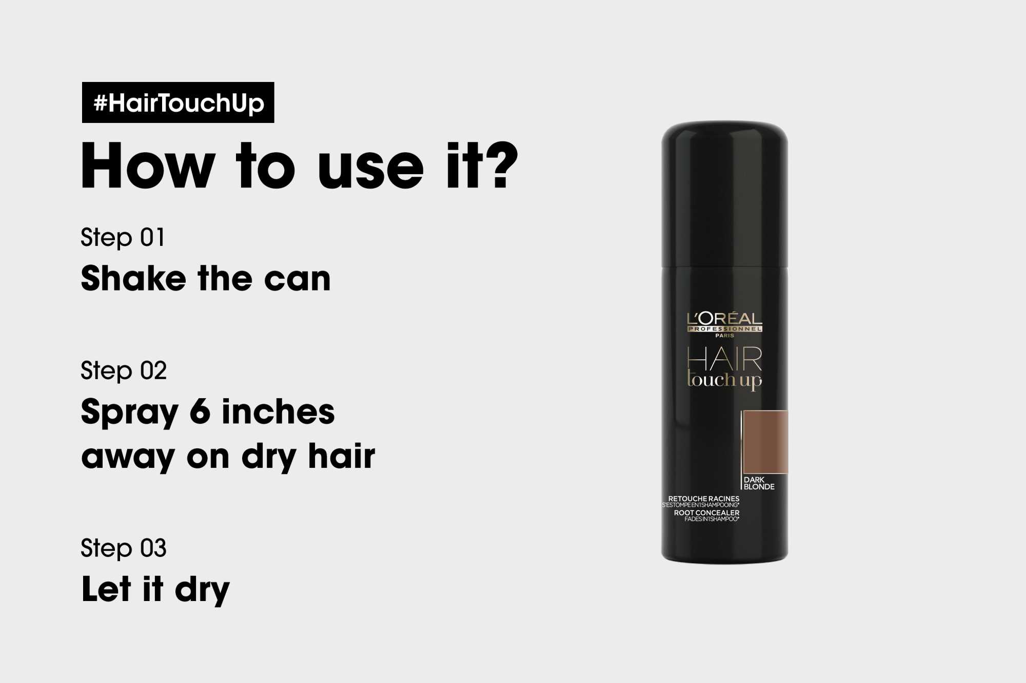 Steg 2: Applicera i torrt och stylat hår, håll flaskan cirka 15 cm från hårbotten.