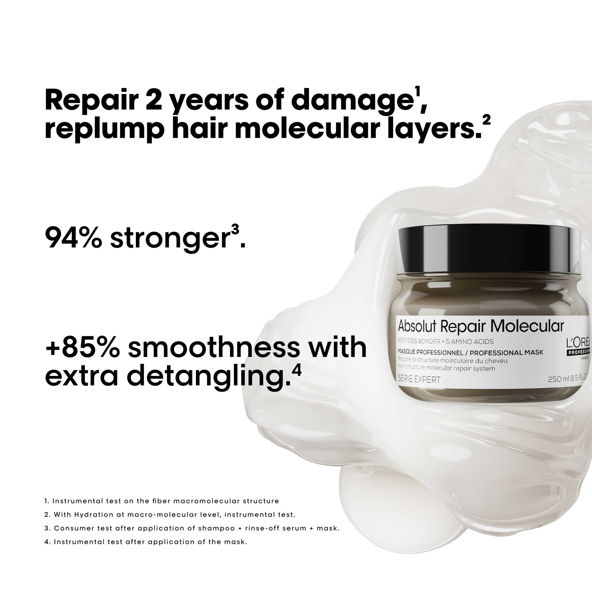 L’Oréal Professionnel Absolut Repair Molecular Rinse-Off Mask är en intensivt reparerande hårmask framtagen för att återuppbygga skadat och försvagat hår på djupet. Formulan är berikad med Peptides Bonder och fem aminosyror som tillsammans verkar på molekylär nivå för att stärka hårfibrerna inifrån. Resultatet är ett hår som känns starkare, mer elastiskt och fullt av liv.