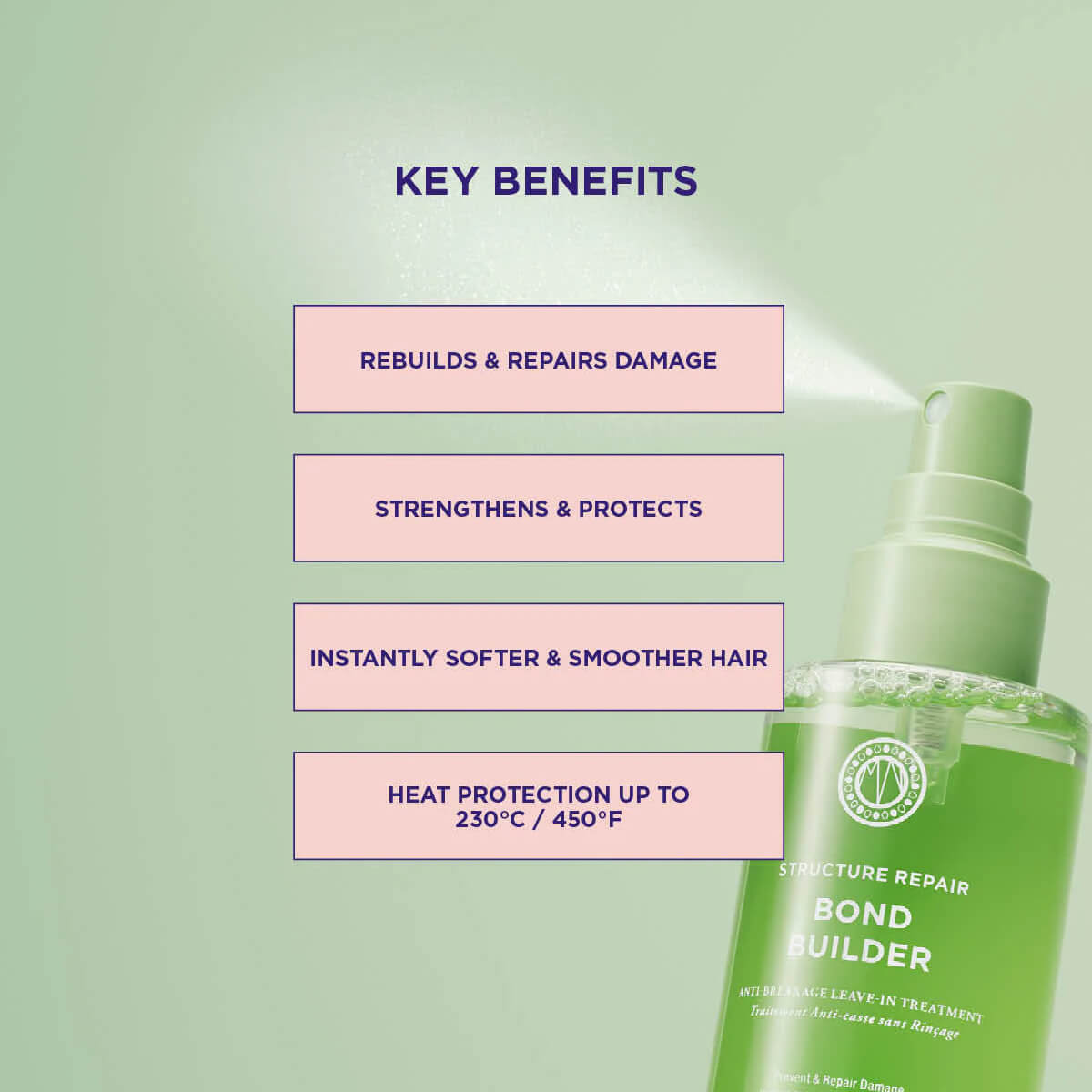 Bond Builder är en lätt leave-in spray med inbyggt värmeskydd upp till 230 °C och kan användas på fuktigt hår för att reparera på djupet, och på torrt hår för att skydda, ge glans och bevara fukt i längderna/ger ett extra skyddande lager mot externa skador. Bond Builder har en frisk, grön och blommig doft med inslag av näckros, grönt äpple och ananasblad.